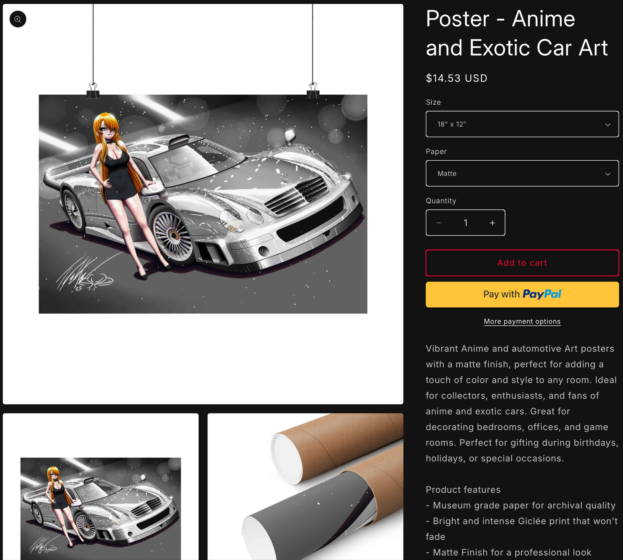 1. To be able to order you will have to email me your selection. Look through the two art gallery’s that are listed Anime/Manga Art Gallery and Automotive Art Gallery each print is listed with a name also and some not available to purchase.2. In the email please list the names of the art piece you want to purchase and please put down your name and address. Then send the email over to me.3. Once I reviewed your order then you can use either PayPal or Cash App to do the payment. I’ll make up a digital receipt of your order and cost.4. Once I get your order packed up and ready to ship I’ll give you a copy of receipt of the shipment with the tracking number. I’ll be watching the shipping progress as well so if something happens I’ll keep you updated make sure it arrives ok.That’s it then you’re good to go! If the order gets damaged and it effected the prints then you will get a new one.